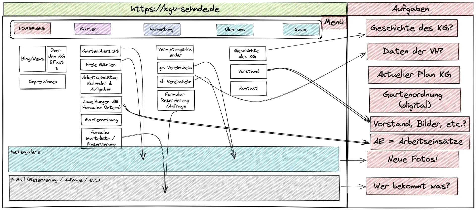 Die Struktur der alten Seite konnte auf keinen Fall übernommen werden und es muss eine neue, anfängliche Gliederung erstellt werden (siehe Bild unten). Damit wir möglichst schnell die wichtigen Kontaktinformationen wieder online haben, werden wir nach und nach an der Gliederung arbeiten und diese umsetzen. Neue Fotos müssen erstellt werden, Informationen müssen digitalisiert und in die Seite eingepflegt werden….